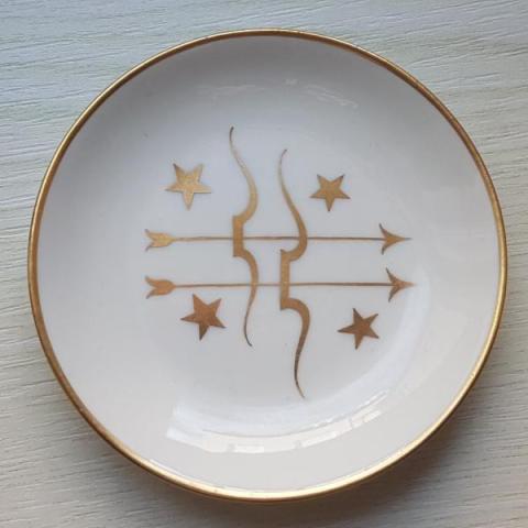 Ciotola bianca e oro con motivo di archi e frecce, decoro Dianesco  attribuibile a Gio Ponti su base stilistica.