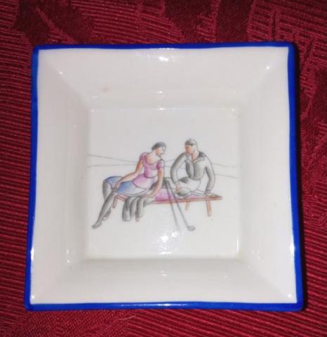 Questo posacenere datato 1938  rappresenta la serie dello  sport del Golf che sebbene non menzionato nel catalogo storico della Manifattura, mantiene lo stesso tono ironico con un evidente contatto con il mondo moderno.